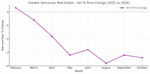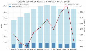 October is typically the last sales peak before the real estate market slows down for the Christmas holidays, and this year we did follow that seasonal trend with an uptick in sales compared to September. That said, October 2025 sales still lagged the same time last year by 14.3%, after actually surpassing year-over-year sales in September by 1%. In other words, we’re back to what has now become our “normal” — sales activity sitting about 10%–20% below the same time last year.