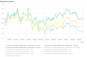 Once the cut was delivered, the uncertainty was removed and yields stabilized as investors paused to reassess the outlook. Through late September, the 5-year GoC yield hovered in a narrow range (~2.72–2.79%), consistent with that “edge-down then