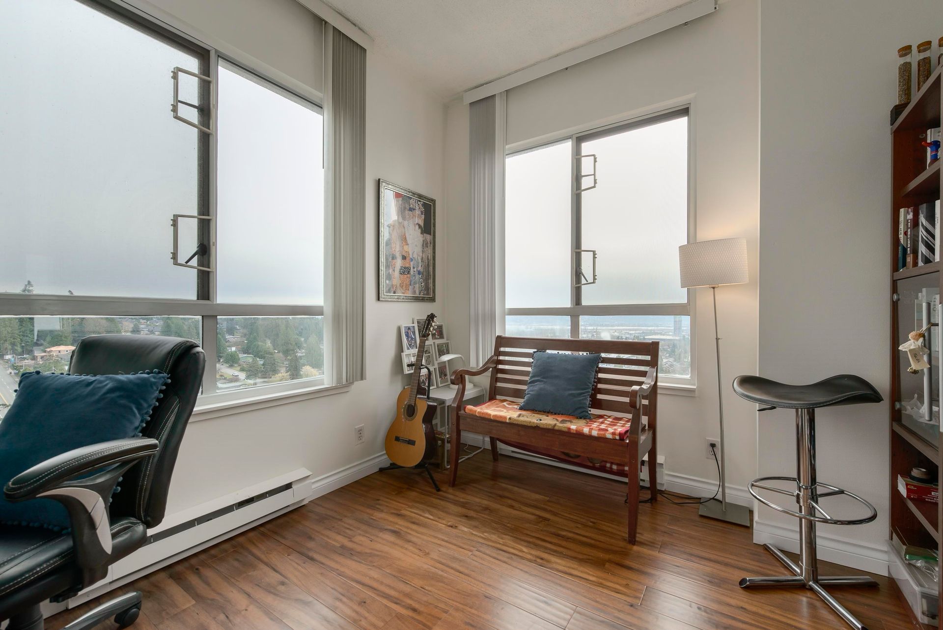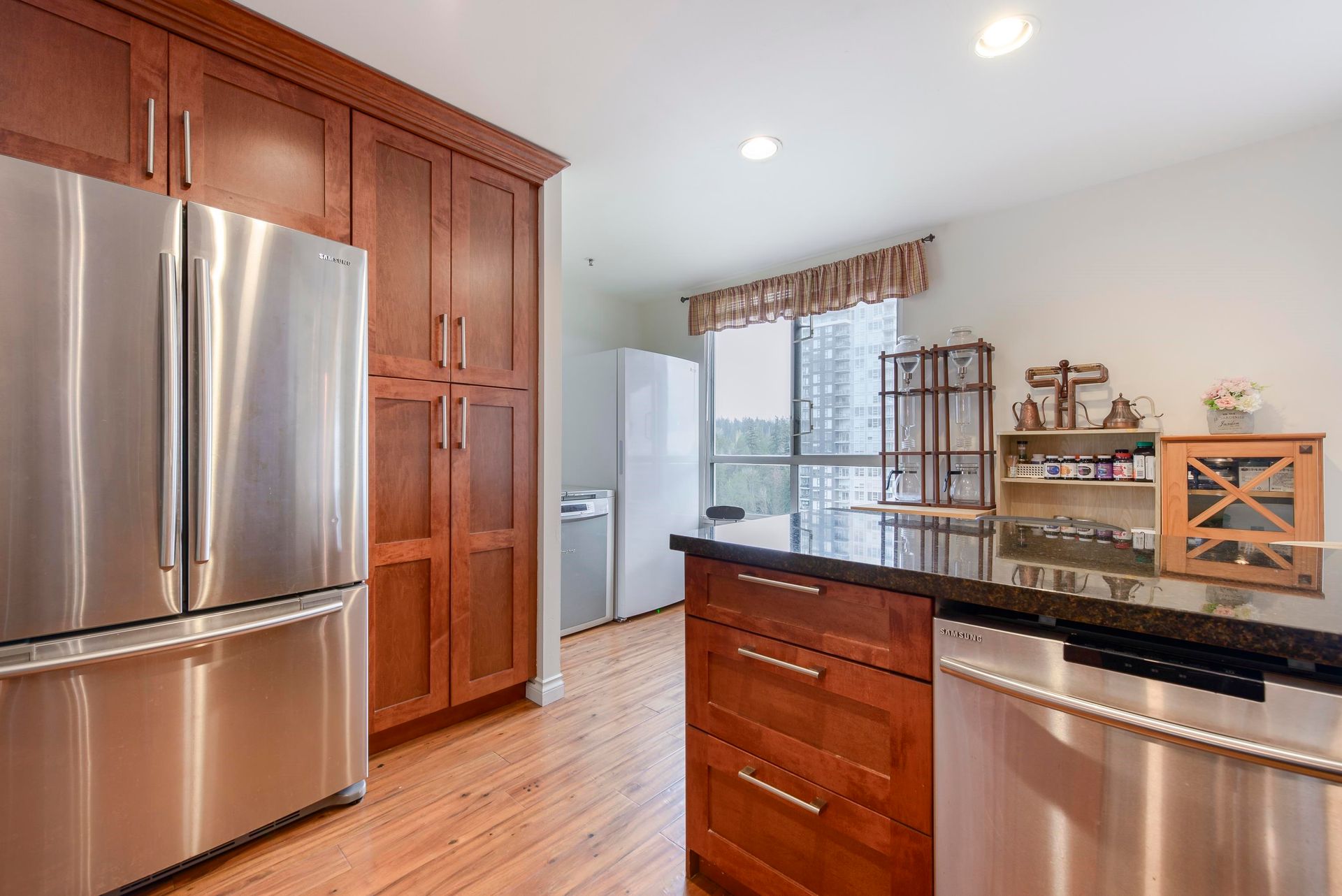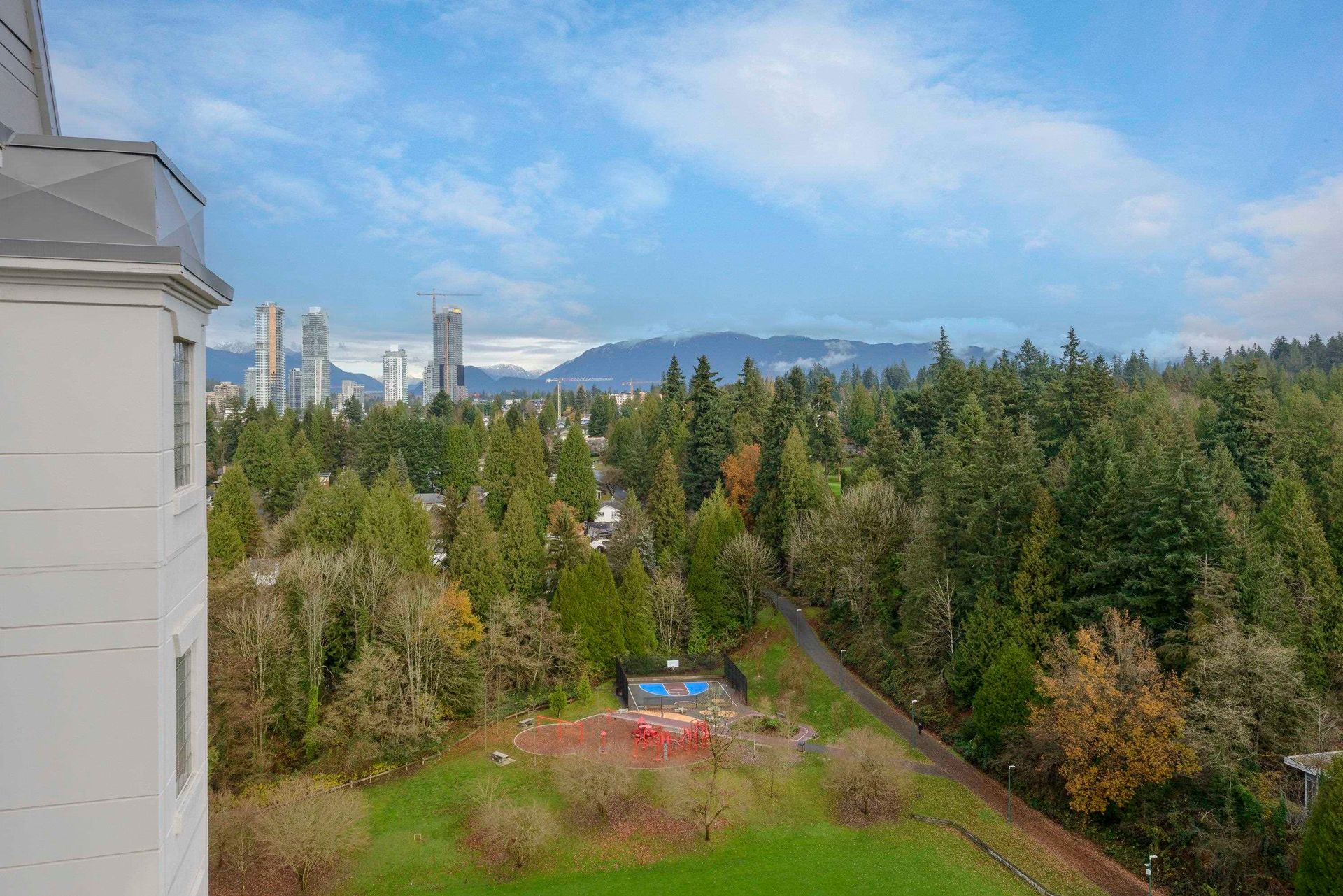 On the top-floor!! Penthouse!! You can enjoy full freedom with a breathtaking view of three directions, N. E. and S.. 2 Bedrooms and 2 bathrooms plus a spacious Den with french door which can be easily counted as a 3th bedroom with a beautiful view again. Hardwood floor living room, kitchen and hallway with ample storage spaces. Granite Countertop and S/S appliances in the huge Kitchen. Open concept layout with big windows and 9' high ceiling in the living room area. Enjoy the convenience of two side-by-side parking stalls right next to the elevator—a significant advantage, BONUS! Amenities include an indoor swimming pool, hot tub, steam room, exercise room and meeting room. 5 minutes walk to Lougheed Mall, skytrain and Vancouver Golf course. Close to Korean Supermarkets; Hannam, H-Mart