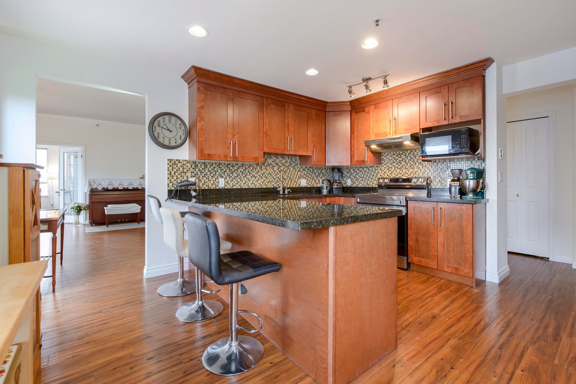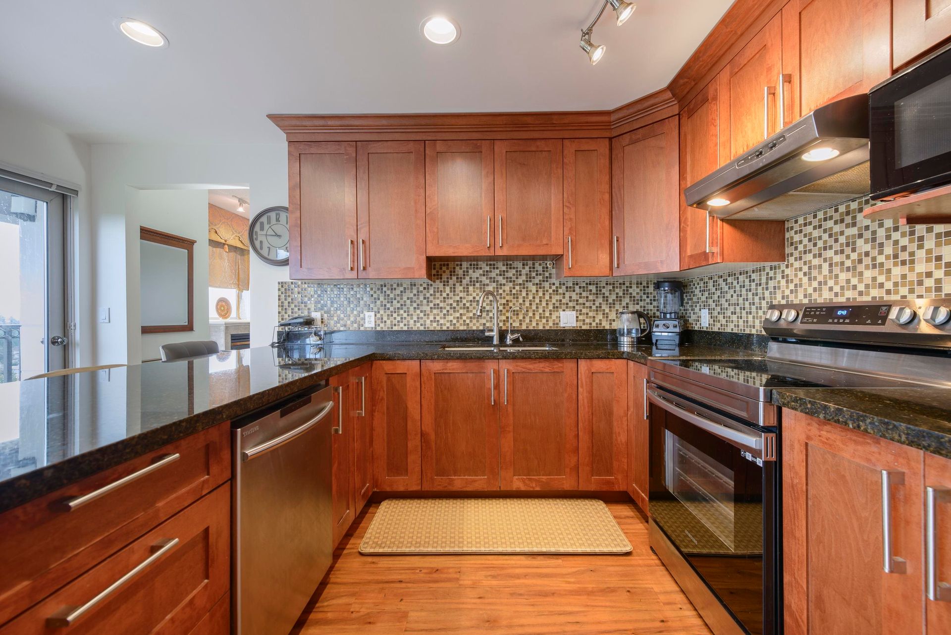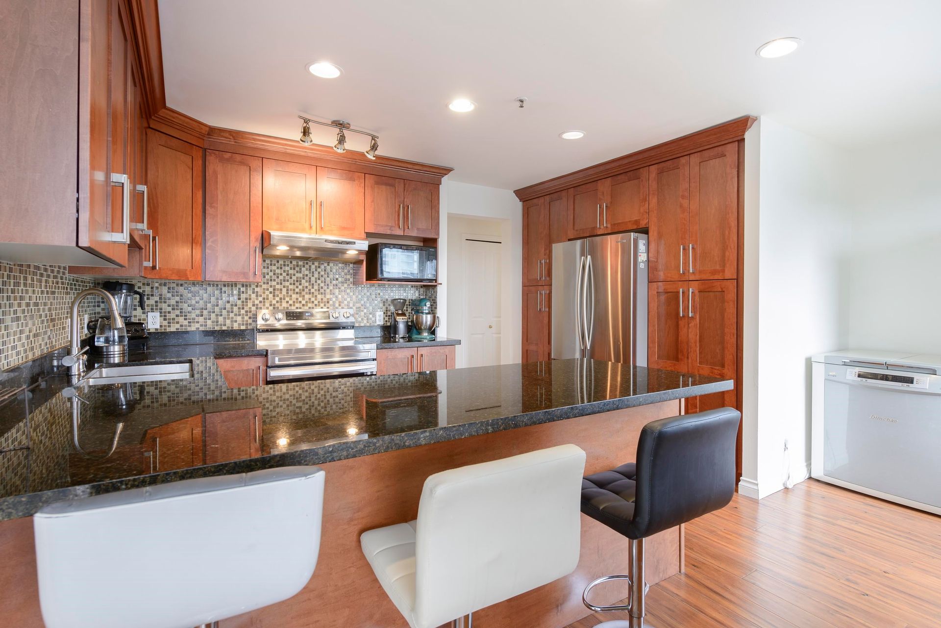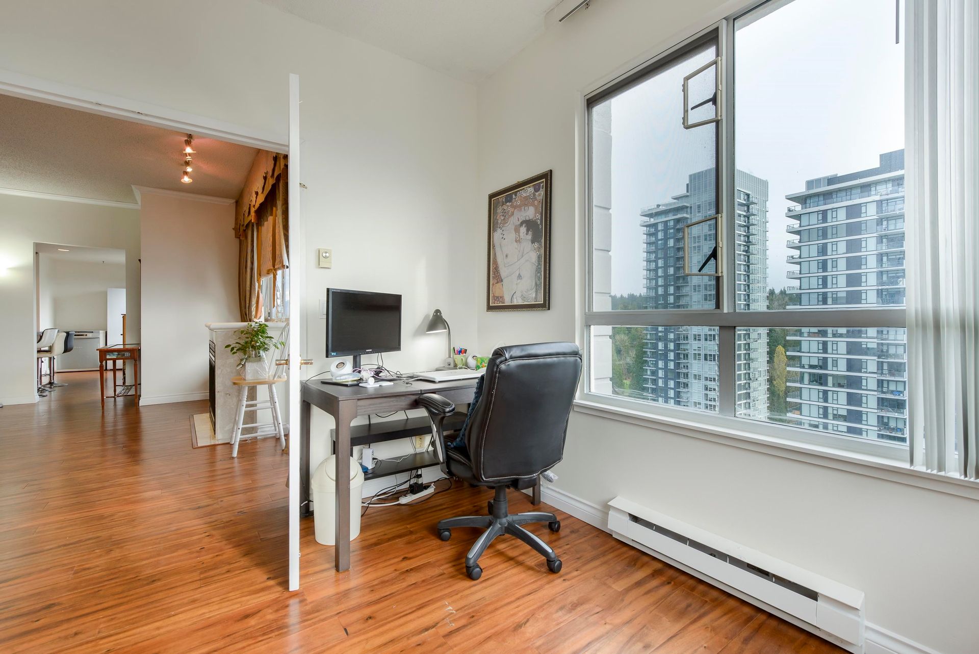 On the top-floor!! Penthouse!! You can enjoy full freedom with a breathtaking view of three directions, N. E. and S.. 2 Bedrooms and 2 bathrooms plus a spacious Den with french door which can be easily counted as a 3th bedroom with a beautiful view again. Hardwood floor living room, kitchen and hallway with ample storage spaces. Granite Countertop and S/S appliances in the huge Kitchen. Open concept layout with big windows and 9' high ceiling in the living room area. Enjoy the convenience of two side-by-side parking stalls right next to the elevator—a significant advantage, BONUS! Amenities include an indoor swimming pool, hot tub, steam room, exercise room and meeting room. 5 minutes walk to Lougheed Mall, skytrain and Vancouver Golf course. Close to Korean Supermarkets; Hannam, H-Mart