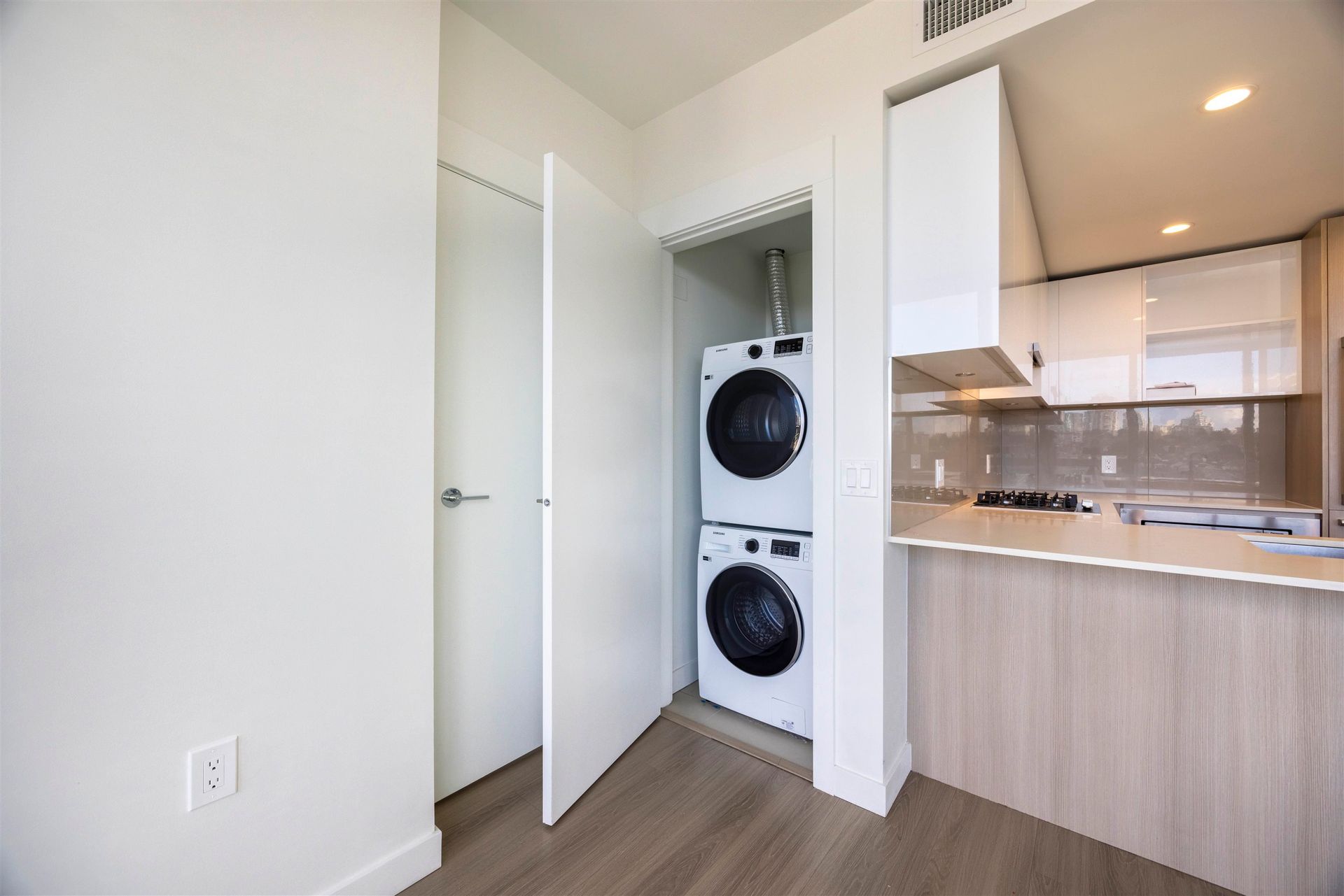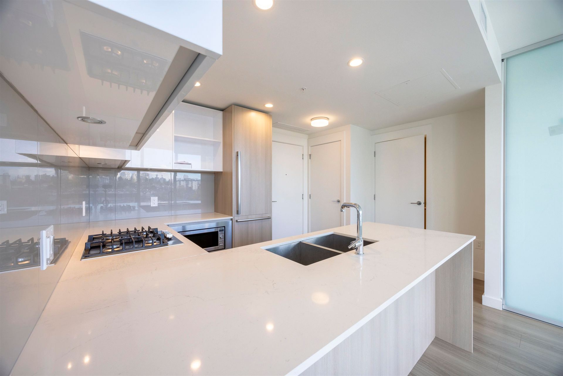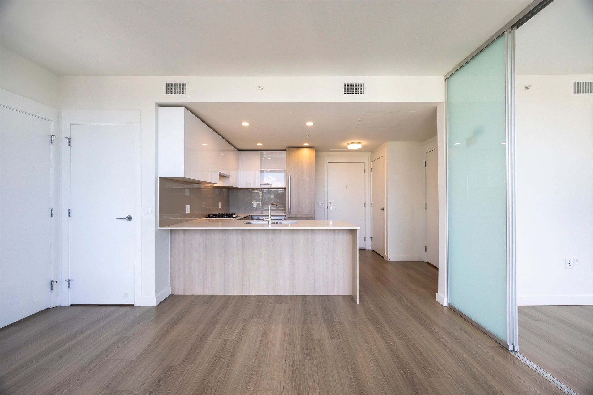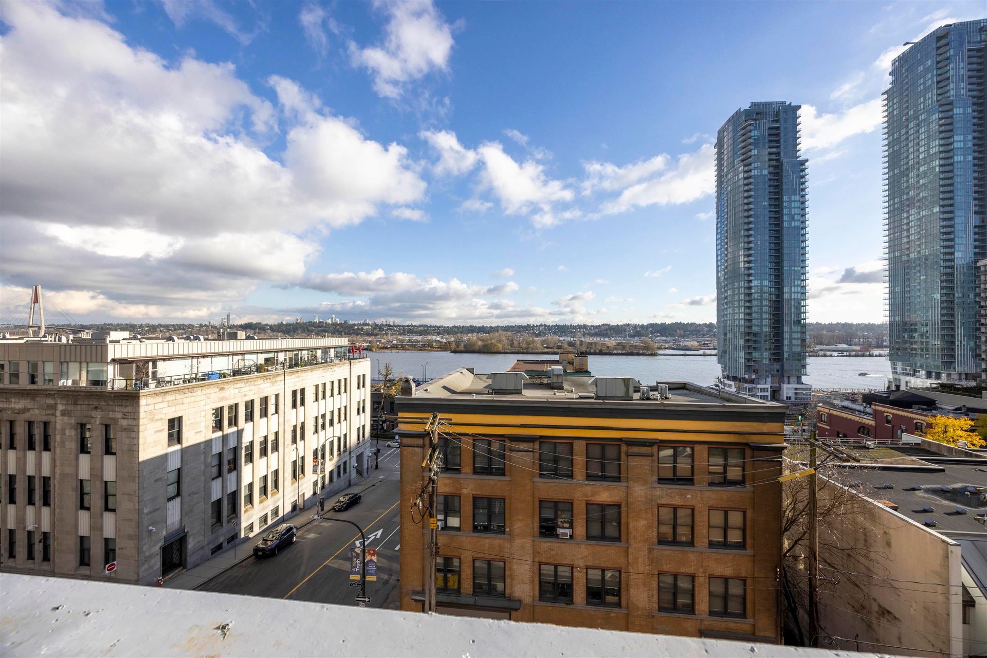 Beautiful Junior 2 bedroom/ 1 bathroom unit, open and functional layout offers a U-Shape Kitchen overlook your the living and dining area. This spacious kitchen is integrated with Bosch stainless appliances (gas cook top, oven, fridge and dishwasher), Panasonic microwave, polished quartz counter-tops, high-end cabinetry, Kohler double under-mount sink. Bathroom is featured with Koehler fixtures, porcelain tiles, contemporary cabinetry and polished Caesarstone countertop. Located at the heart of Downtown New Westminster: minutes to skytrain station, restaurant, groceries, Cineplex.