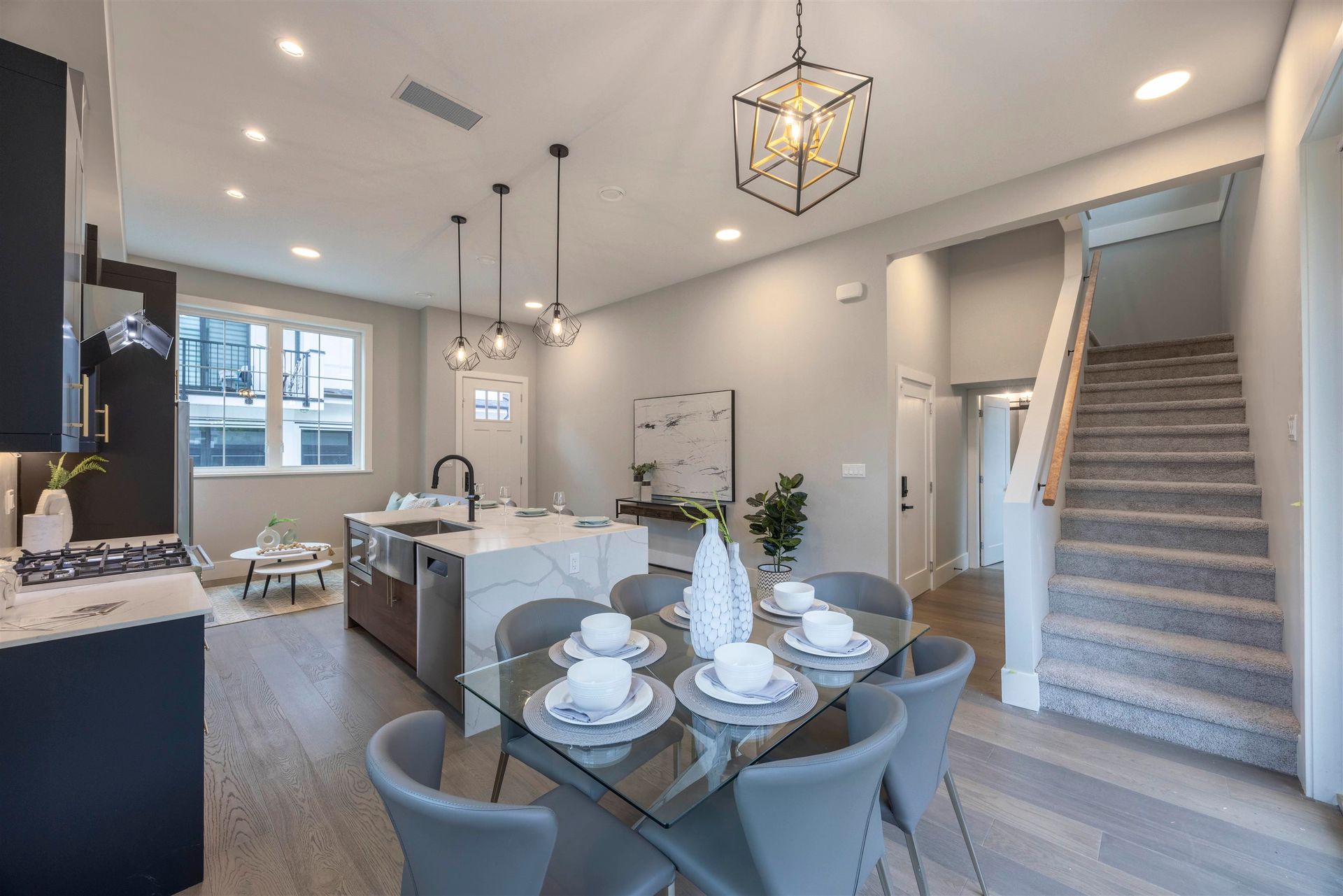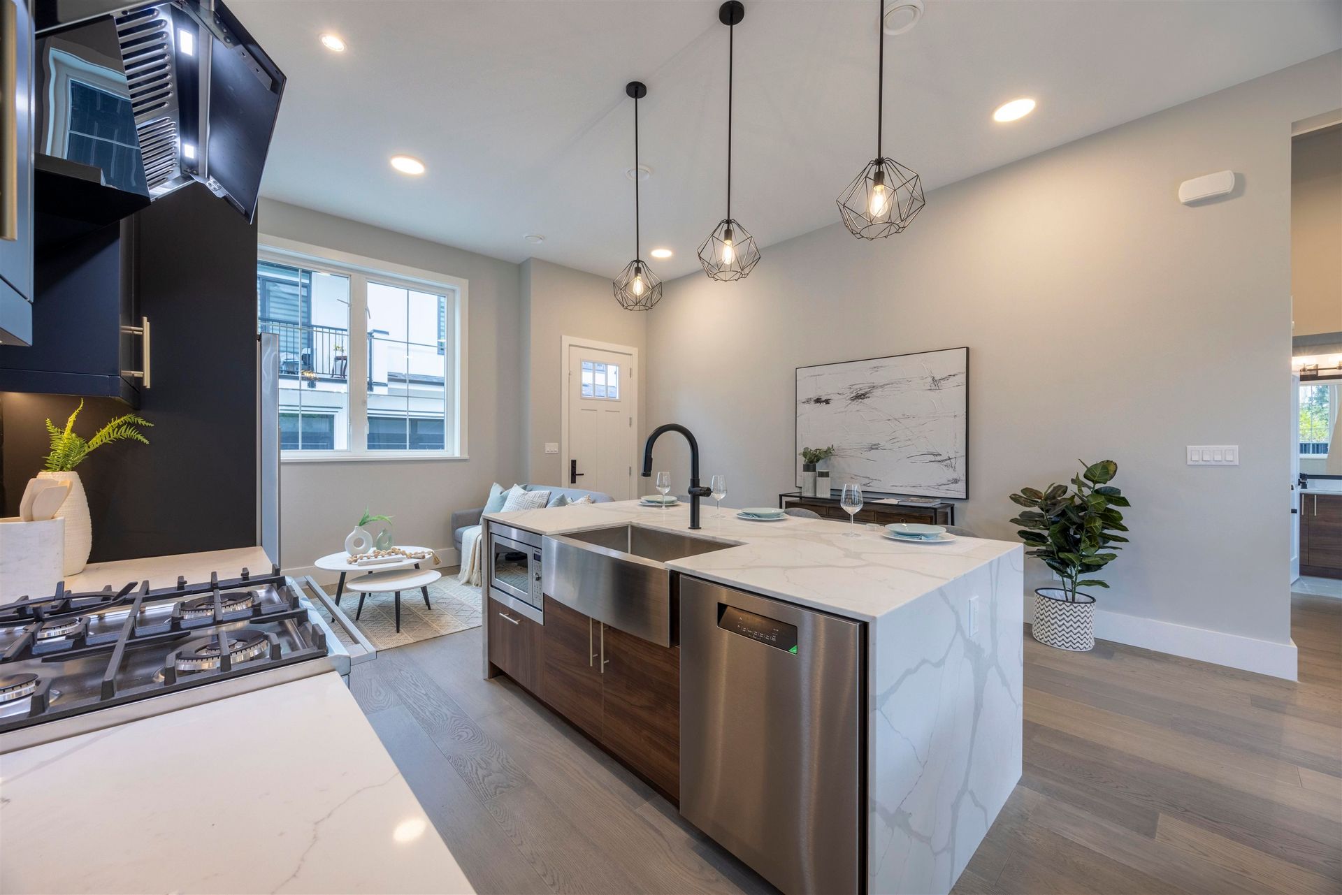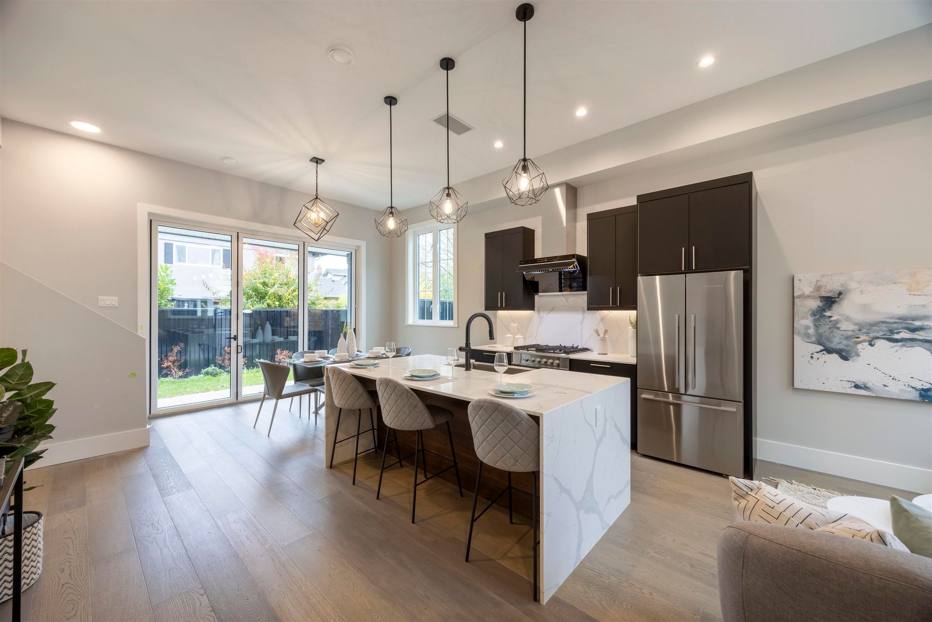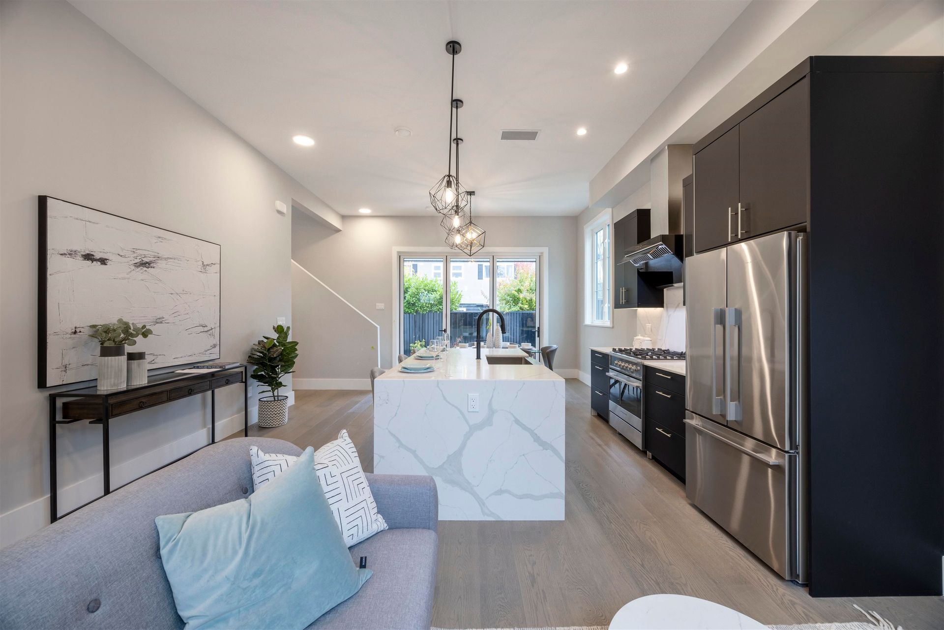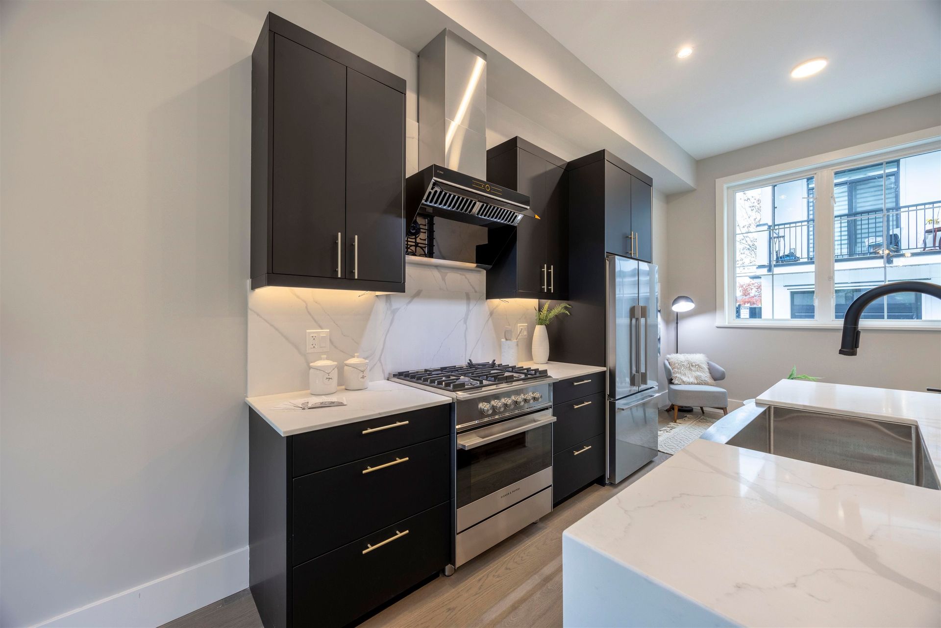 Experience luxury in this meticulously crafted duplex-style home, showcasing thoughtful finishes throughout. With 11' ceilings on the main floor and 10' on the second, this bright and spacious living area features floor-to-ceiling folding balcony doors. The deluxe kitchen includes a waterfall marble island, Fisher & Paykel appliances, Kohler faucet, custom wood cabinets, and a high-efficiency Fotile hood fan. The ground-floor bedroom has rough-in plumbing ready for added flexibility. The primary suite boasts a large walk-in closet and hotel-style bathroom with freestanding tub, shower, and double vanity. This 3-bedroom, 2.5-bathroom home also offers A/C, and smart home security. Open House Aug 17, 2-4PM