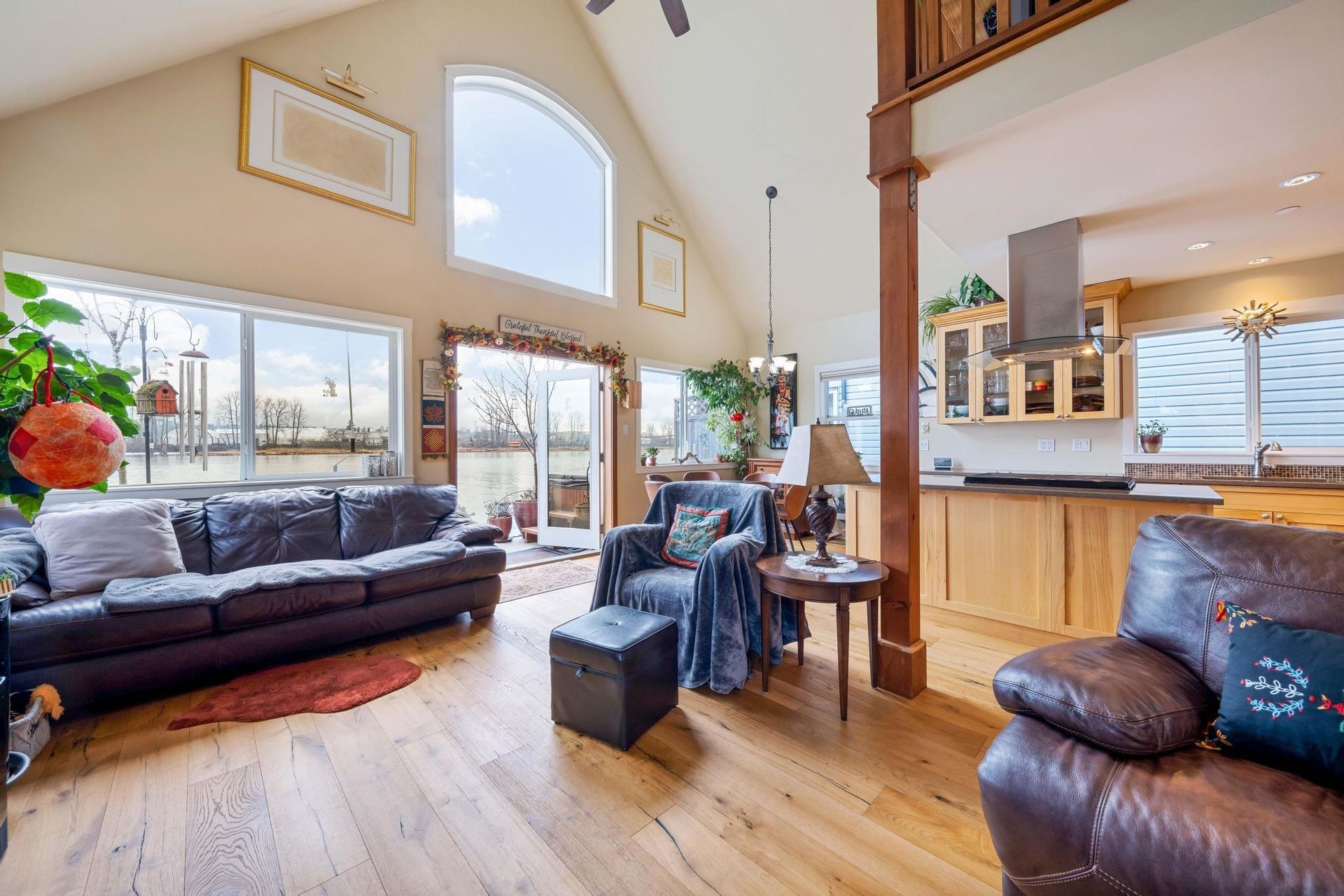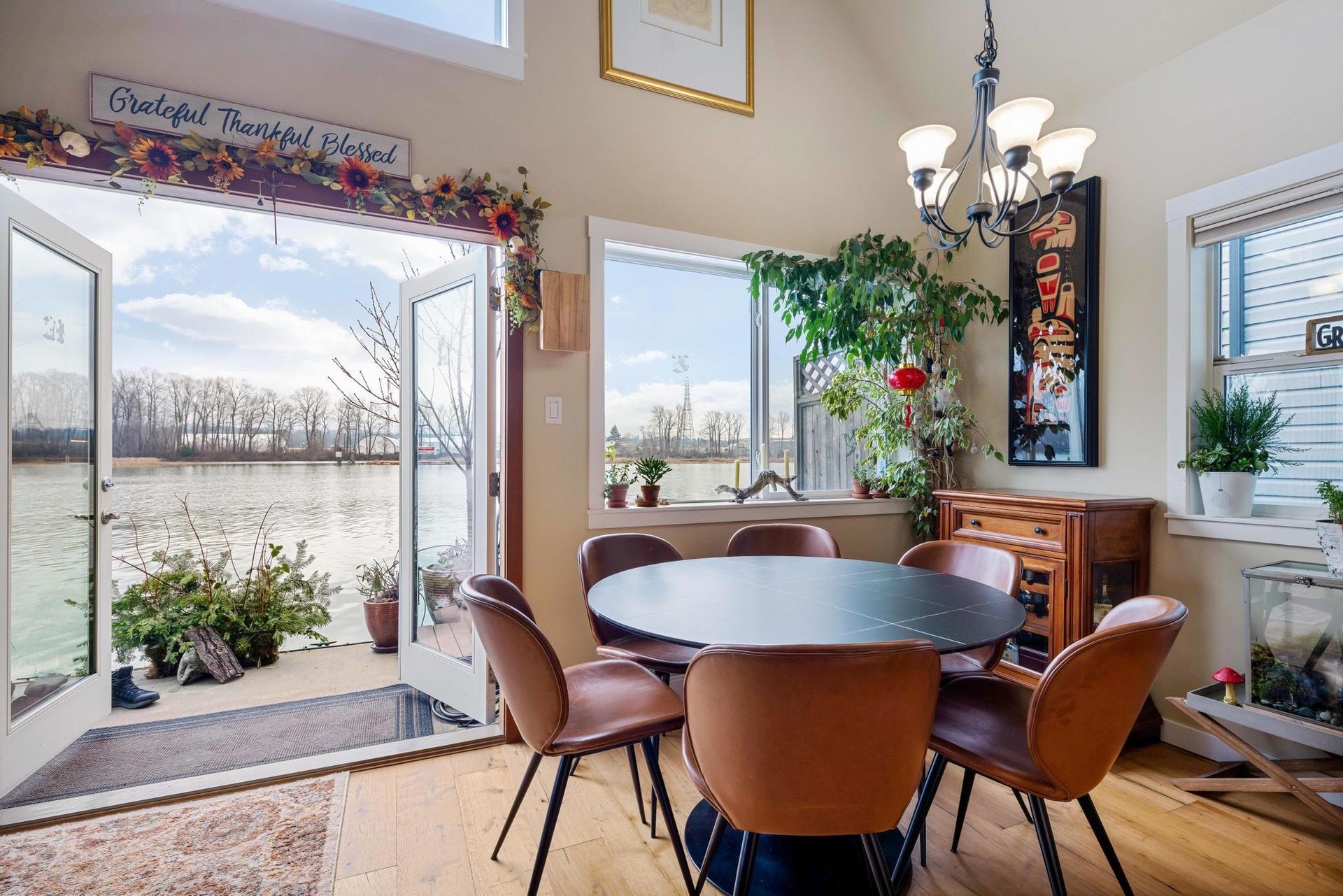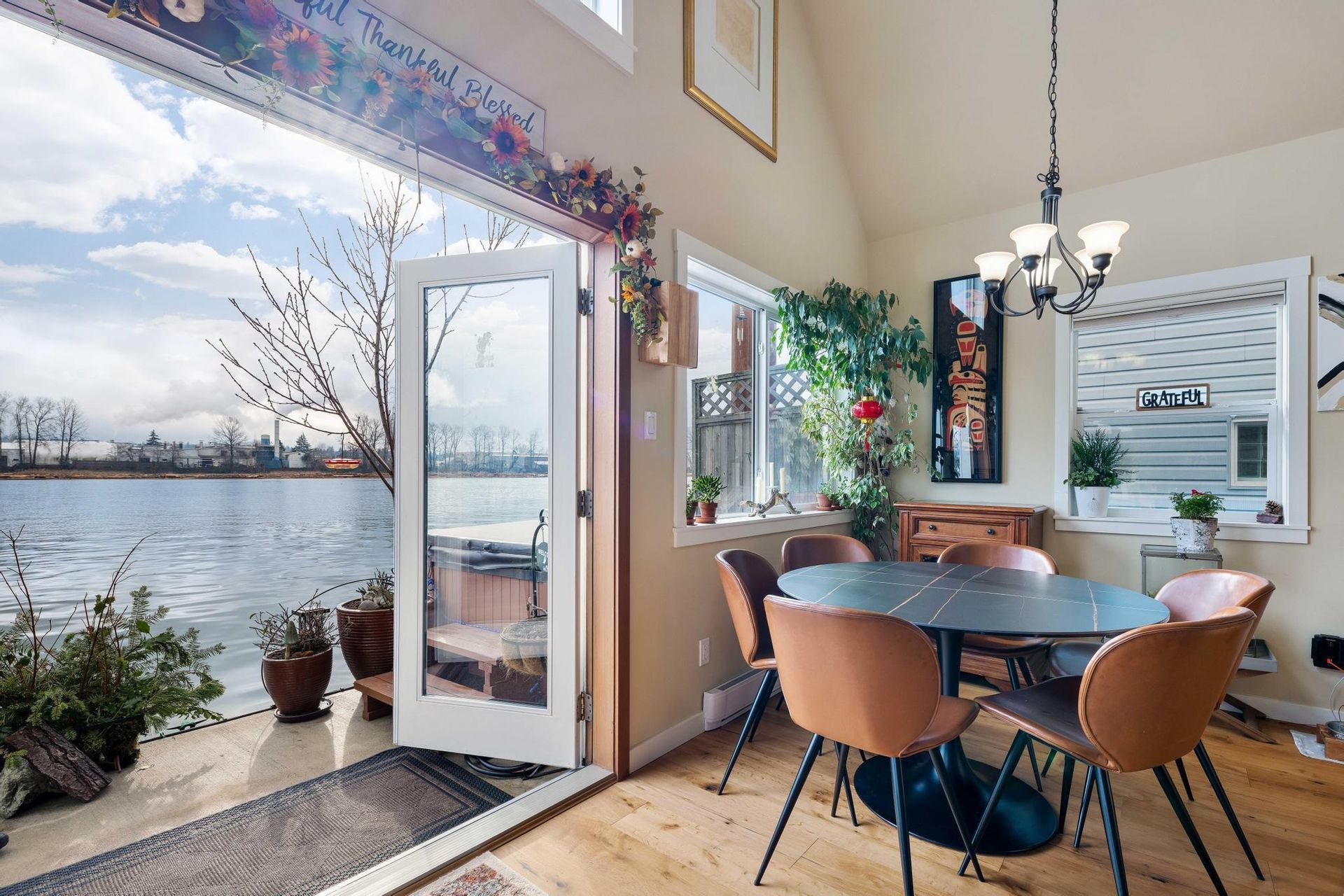 Rare opportunity to own a freehold water lot with a 3 bed 2 bath float home in an exclusive marina community. Just 10 years old, this AJIA Custom-built Craftsman offers vaulted ceilings, open living, and energy-efficient design that feels like 1500sf. Enjoy stunning sunrises and sunsets, or fish for all species of salmon and sturgeon right from your dock. Rich wood accents bring warmth and harmony with nature. Includes hot tub, float, kayaks, and boat—ready for your waterfront lifestyle. Host guests on the 450sf commercial float or relax in the hot tub with panoramic views. Located on a deeded bare land strata foreshore (no moorage fees), with 1 parking stall and ample street parking.
