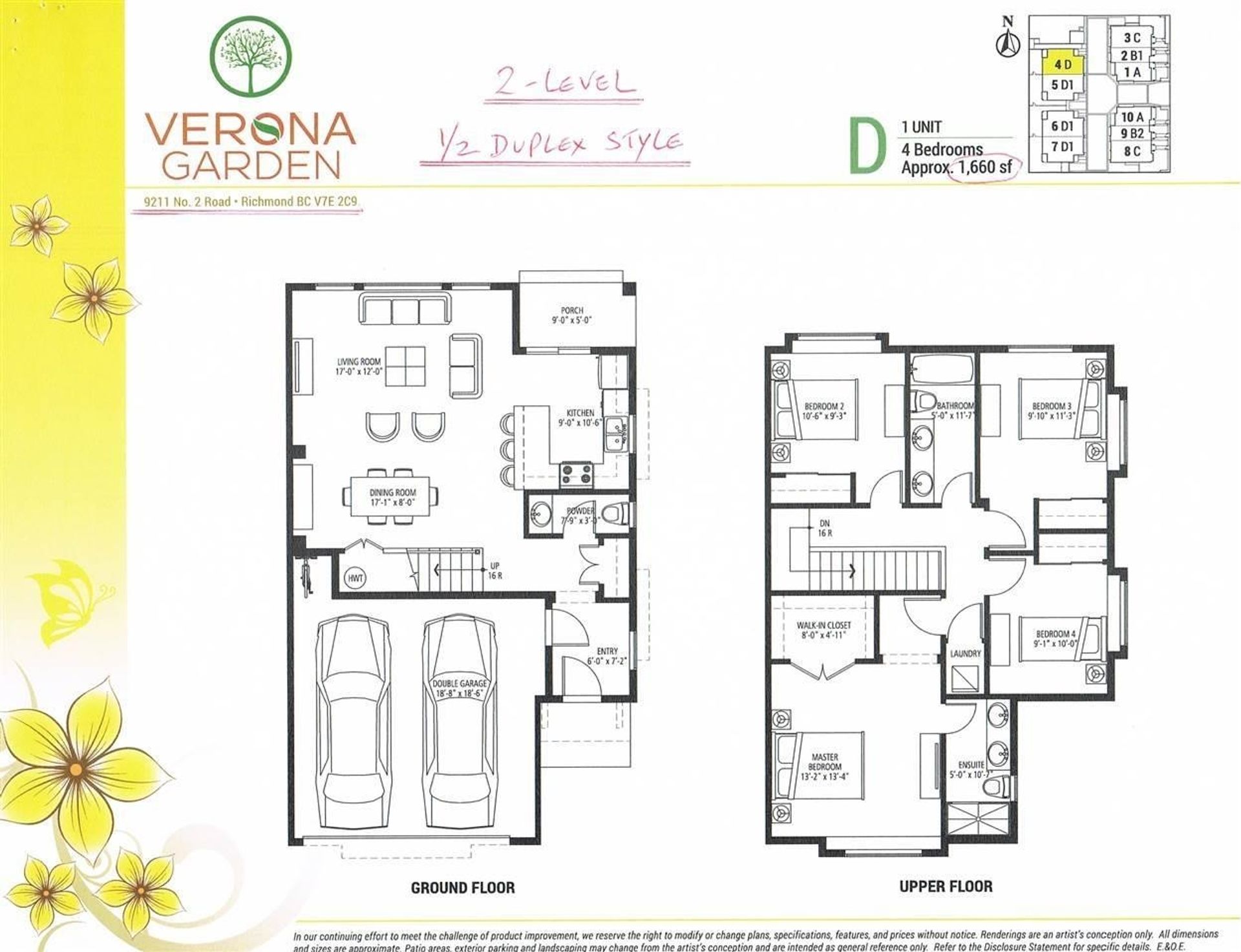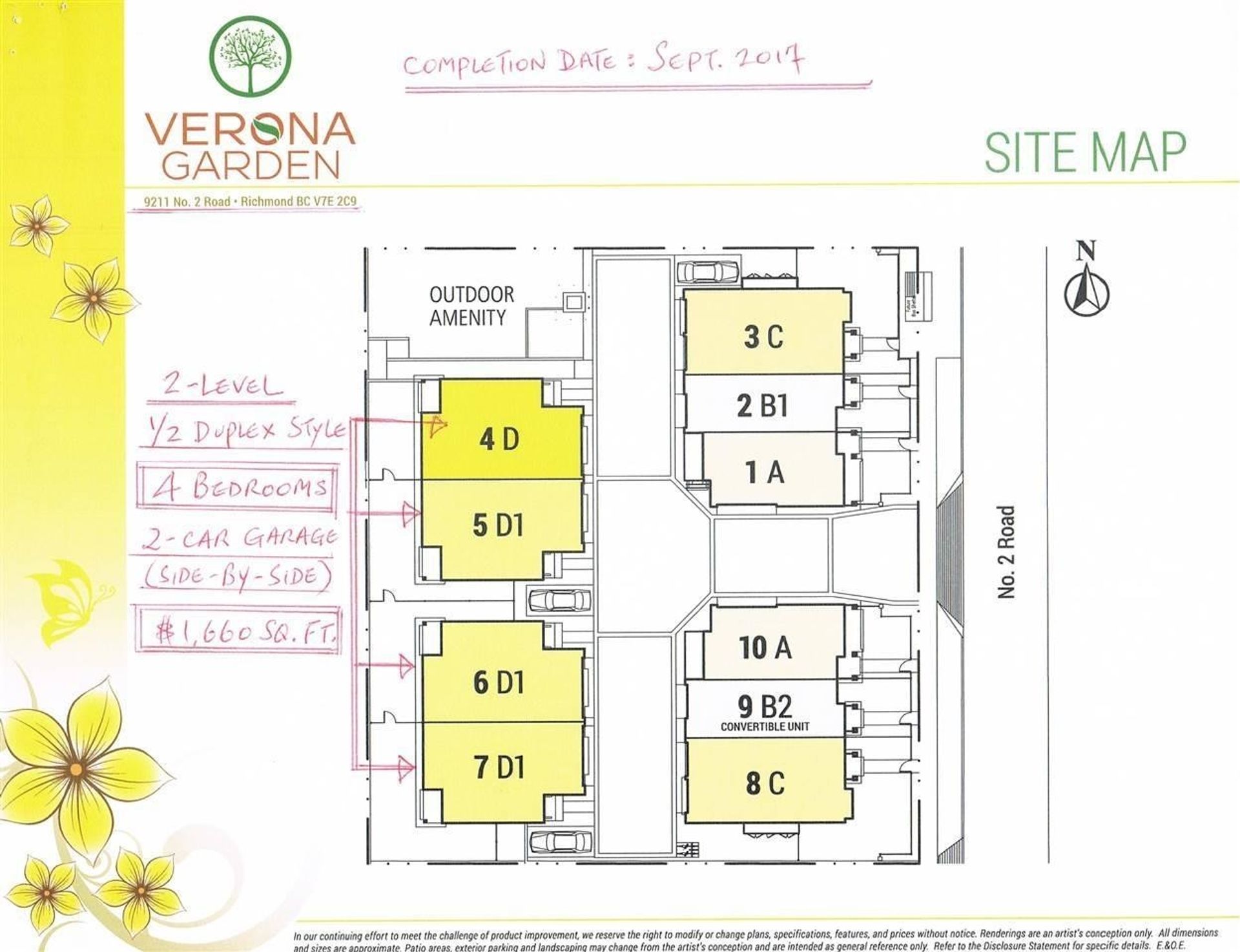 VERONA GARDEN is a 2 Level luxury duplex-style Townhouse centrally located between Maple Road & Woodwards Road in Richmond. 4 Bedrooms +3 Bathrooms and 1660 sq ft. Features Kraus laminate flooring, 9 ft ceiling on main, double SIDE-BY-SIDE garage, HRV ventilation system for bathrooms and fresh air to living room and bedrooms. The kitchen comes with double quartz countertops & stainless steel kitchen appliances. Bathrooms have designer floor and wall tiles & polished Kohler fixtures. Steps to Jessie Wowk & Daniel Woodwards Elementry School & Steveston London Secondary School.