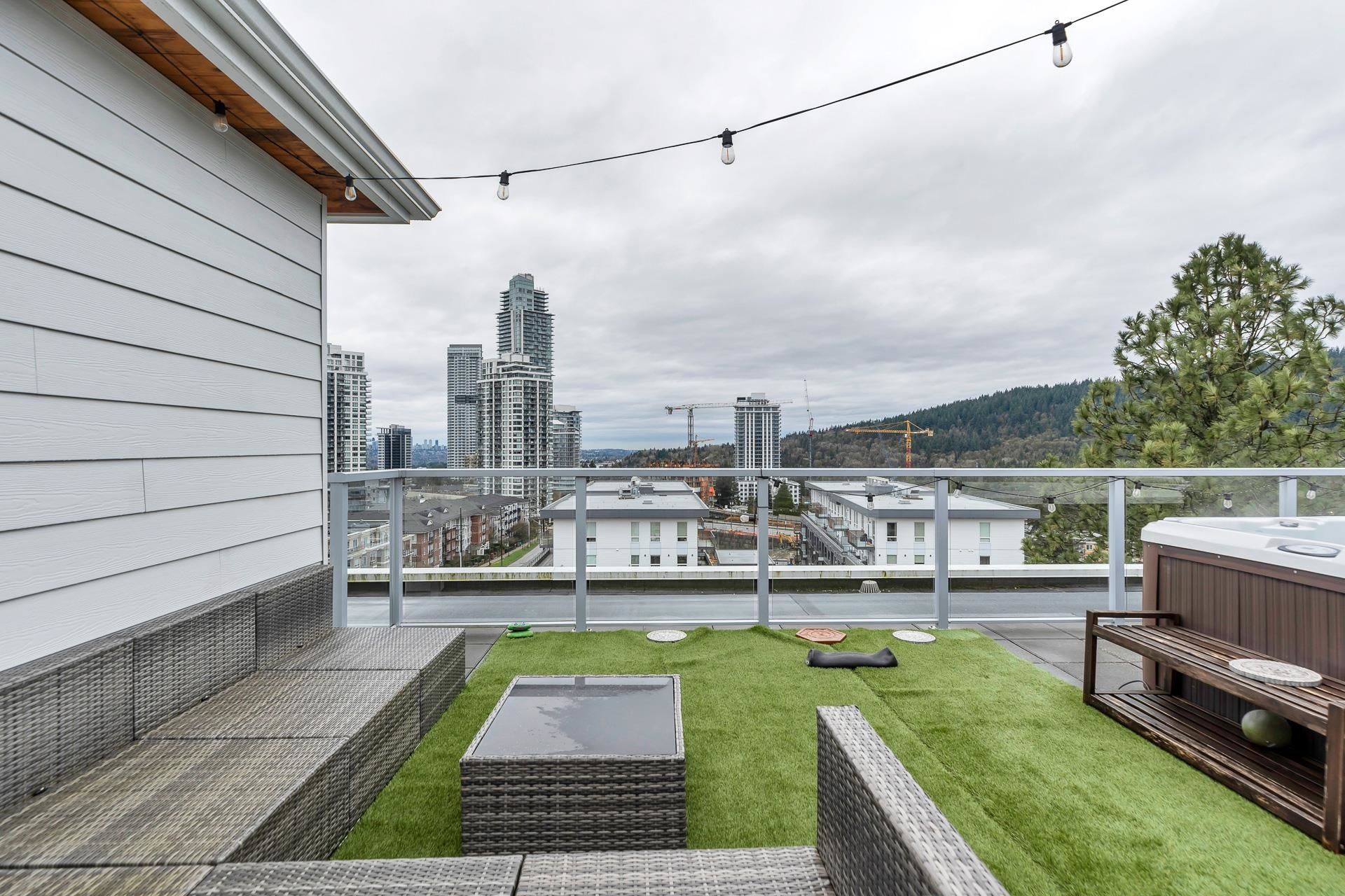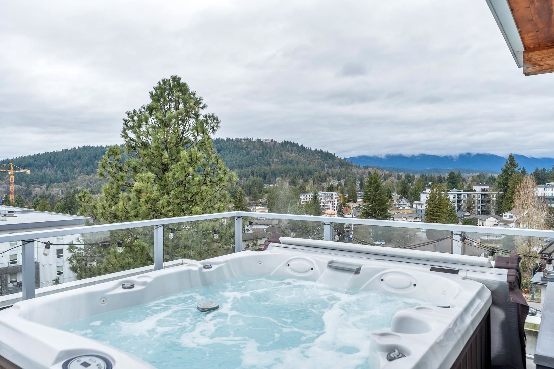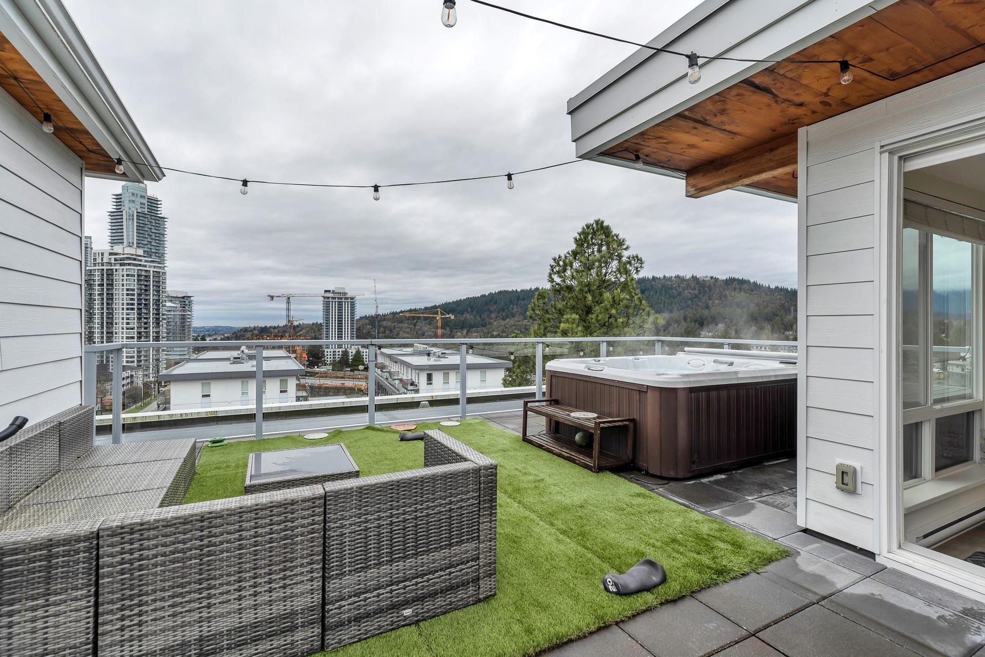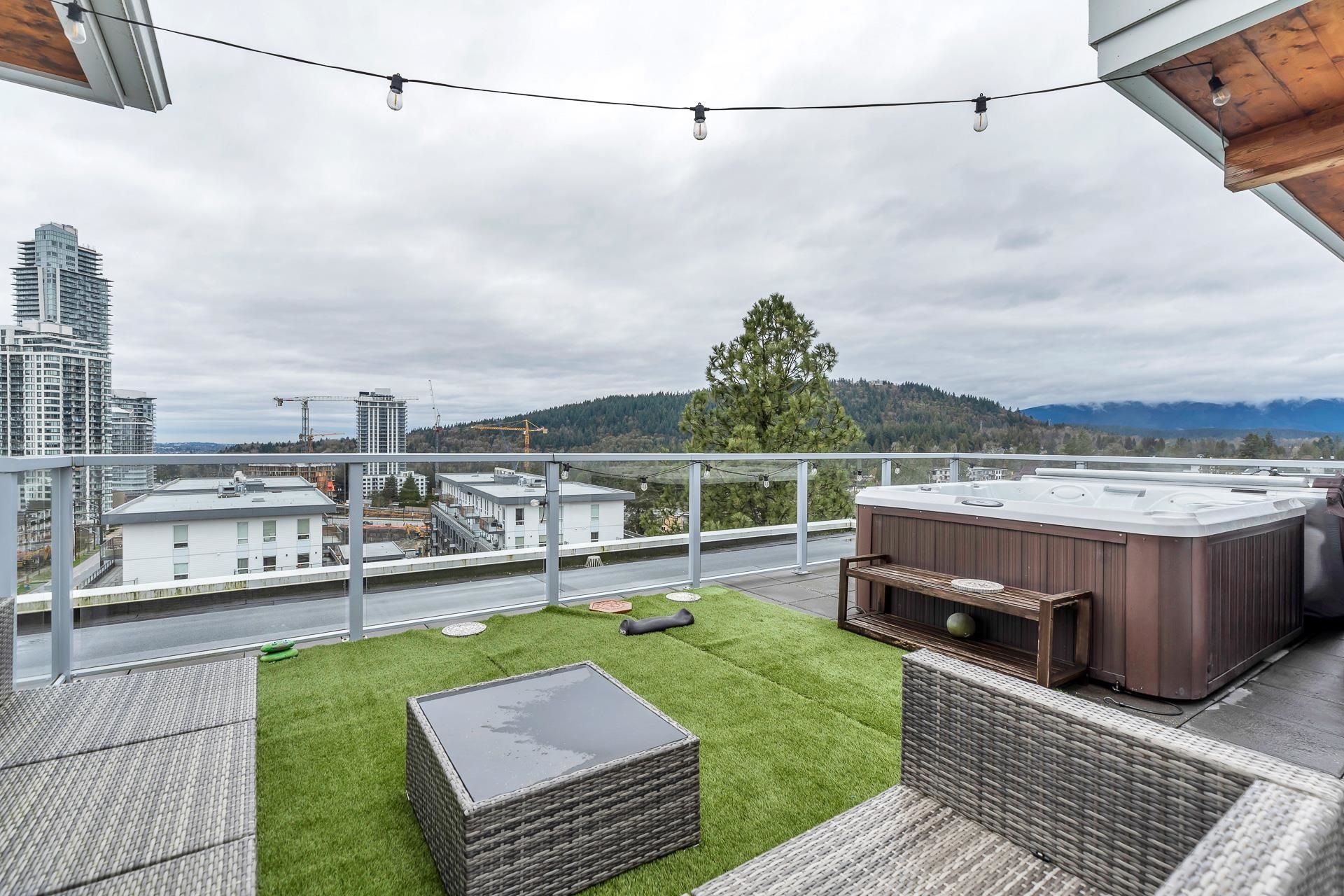 Welcome to YOUR NEW HOME situated in the desirable Coquitlam West Neighborhood. This penthouse unit features 2 bedrooms + 1 den, in addition to 2 bathrooms. The unit boasts a Private 521 Sq Ft rooftop patio on the 7th Floor, equipped with its own hot tub and stunning views of the city and mountains! This unit has a modern layout with an open concept design, along with an 82 Sq Ft balcony off the kitchen. The interior space is furnished with Premium Kitchen Aid stainless steel appliances, gas stove, garburator, and quartz countertops. The laundry is conveniently located within the suite! The property includes 2 standard parking spaces (1 is EV ready) and 2 storage lockers. It is ideally positioned just steps away from the Burquitlam sky train station, shopping centers, schools and parks!