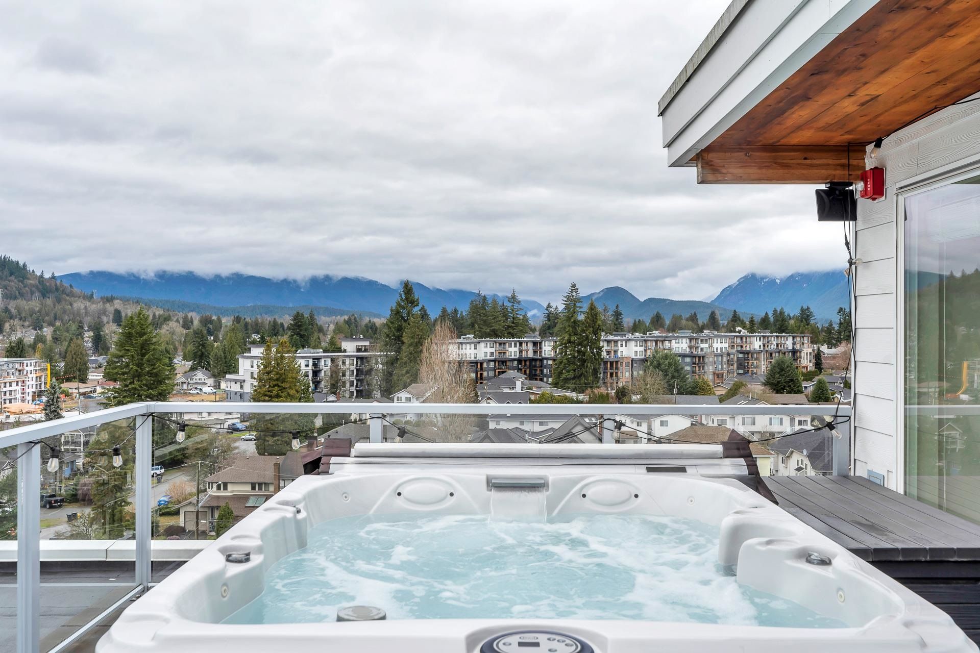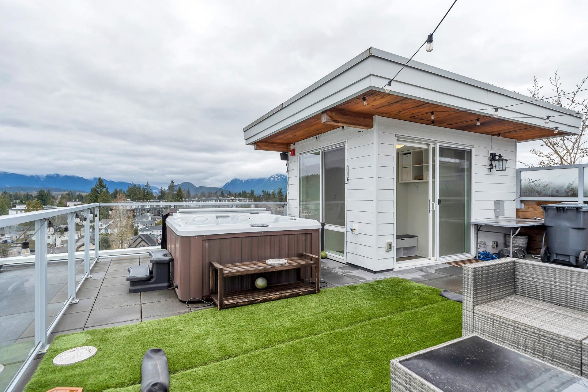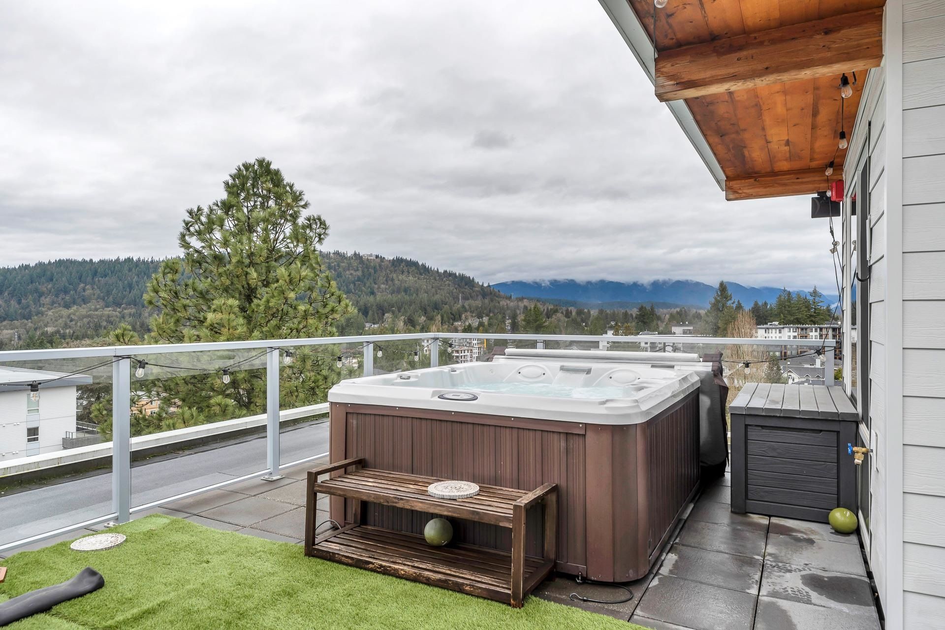 Welcome to YOUR NEW HOME situated in the desirable Coquitlam West Neighborhood. This penthouse unit features 2 bedrooms + 1 den, in addition to 2 bathrooms. The unit boasts a Private 521 Sq Ft rooftop patio on the 7th Floor, equipped with its own hot tub and stunning views of the city and mountains! This unit has a modern layout with an open concept design, along with an 82 Sq Ft balcony off the kitchen. The interior space is furnished with Premium Kitchen Aid stainless steel appliances, gas stove, garburator, and quartz countertops. The laundry is conveniently located within the suite! The property includes 2 standard parking spaces (1 is EV ready) and 2 storage lockers. It is ideally positioned just steps away from the Burquitlam sky train station, shopping centers, schools and parks!